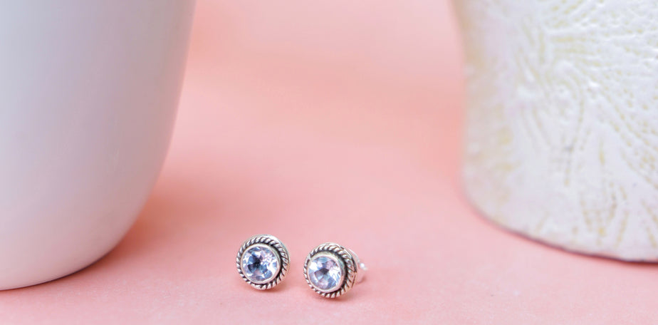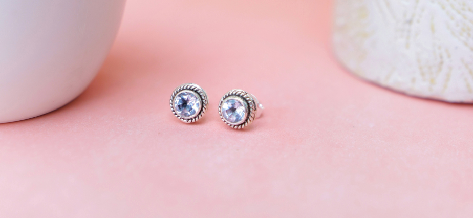 A round, transparent topaz is studded in the center of these studs. It is a perfect pair to wear...